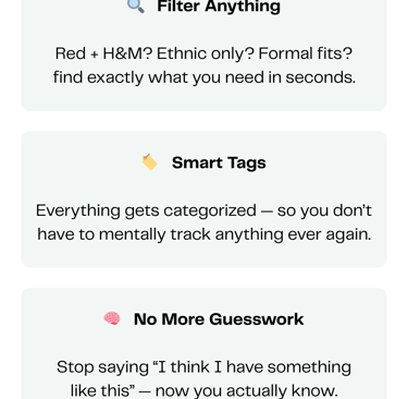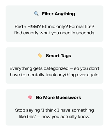 Add everything you own, filter anything you need, and never forget a piece again.
